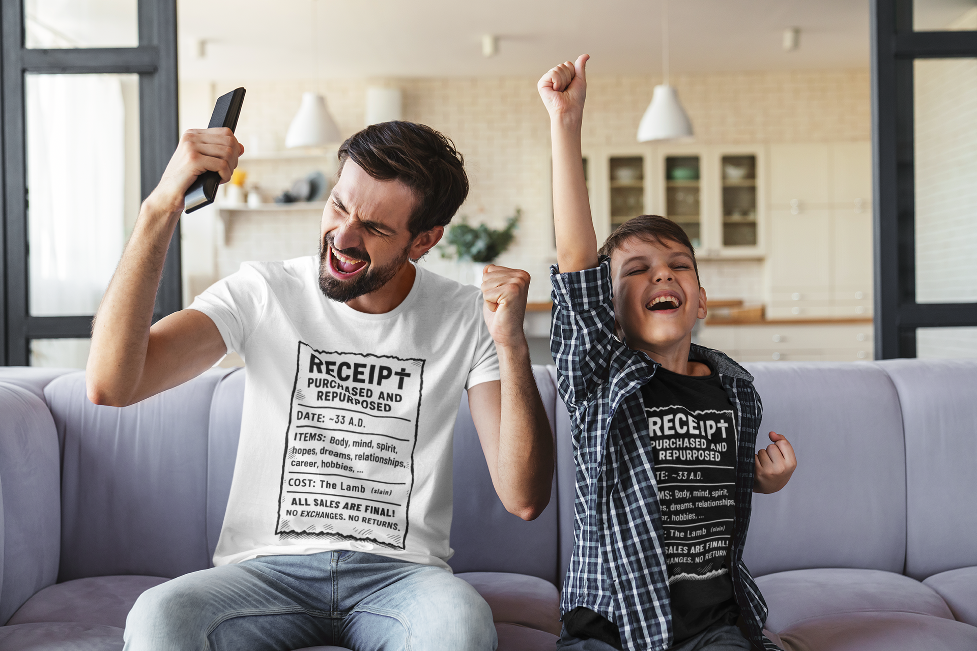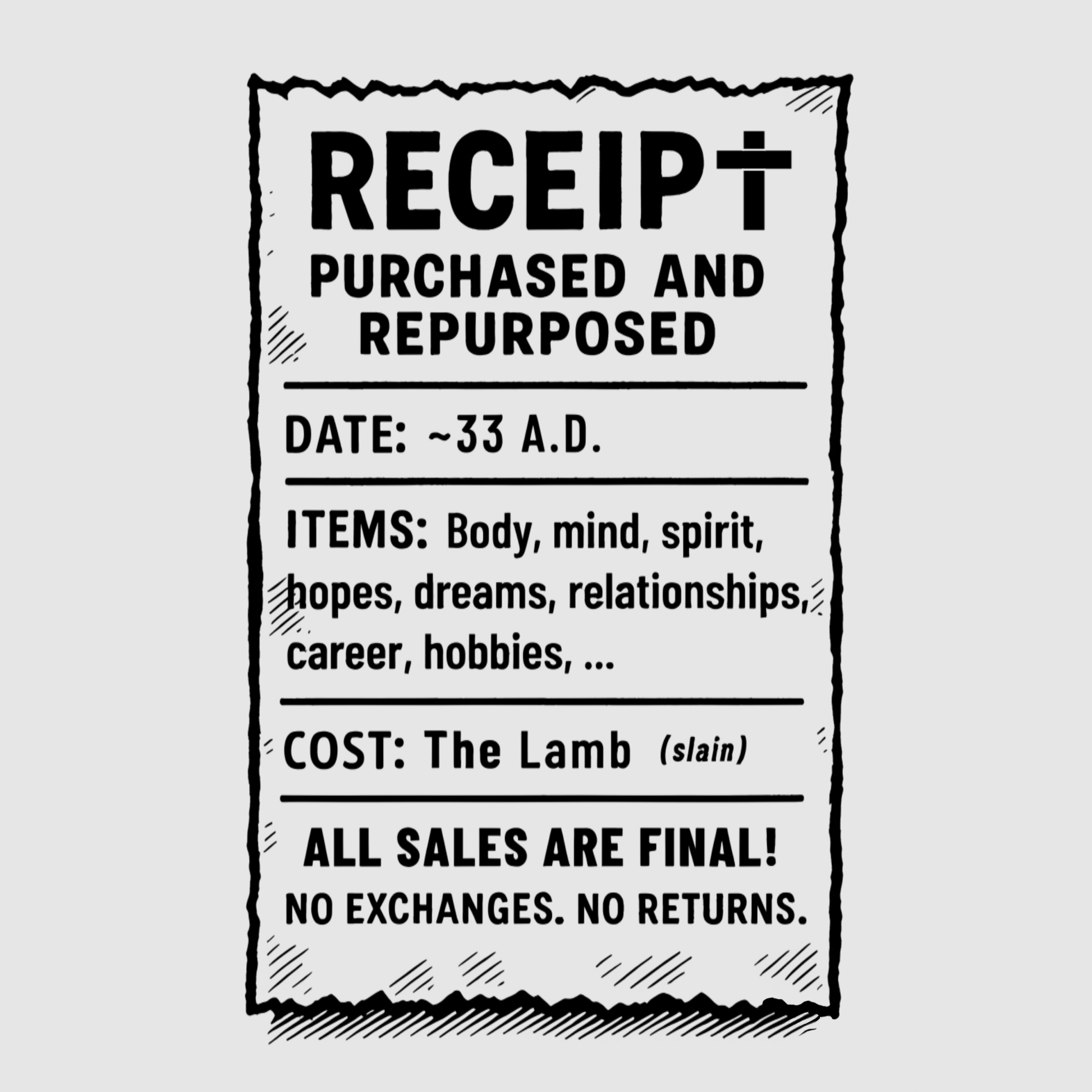 This striking tee features a vintage receipt design declaring that every part of you—body, mind, spirit, hopes, dreams, relationships, and beyond—was purchased and repurposed around 33 A.D. The cost? The Lamb, slain.